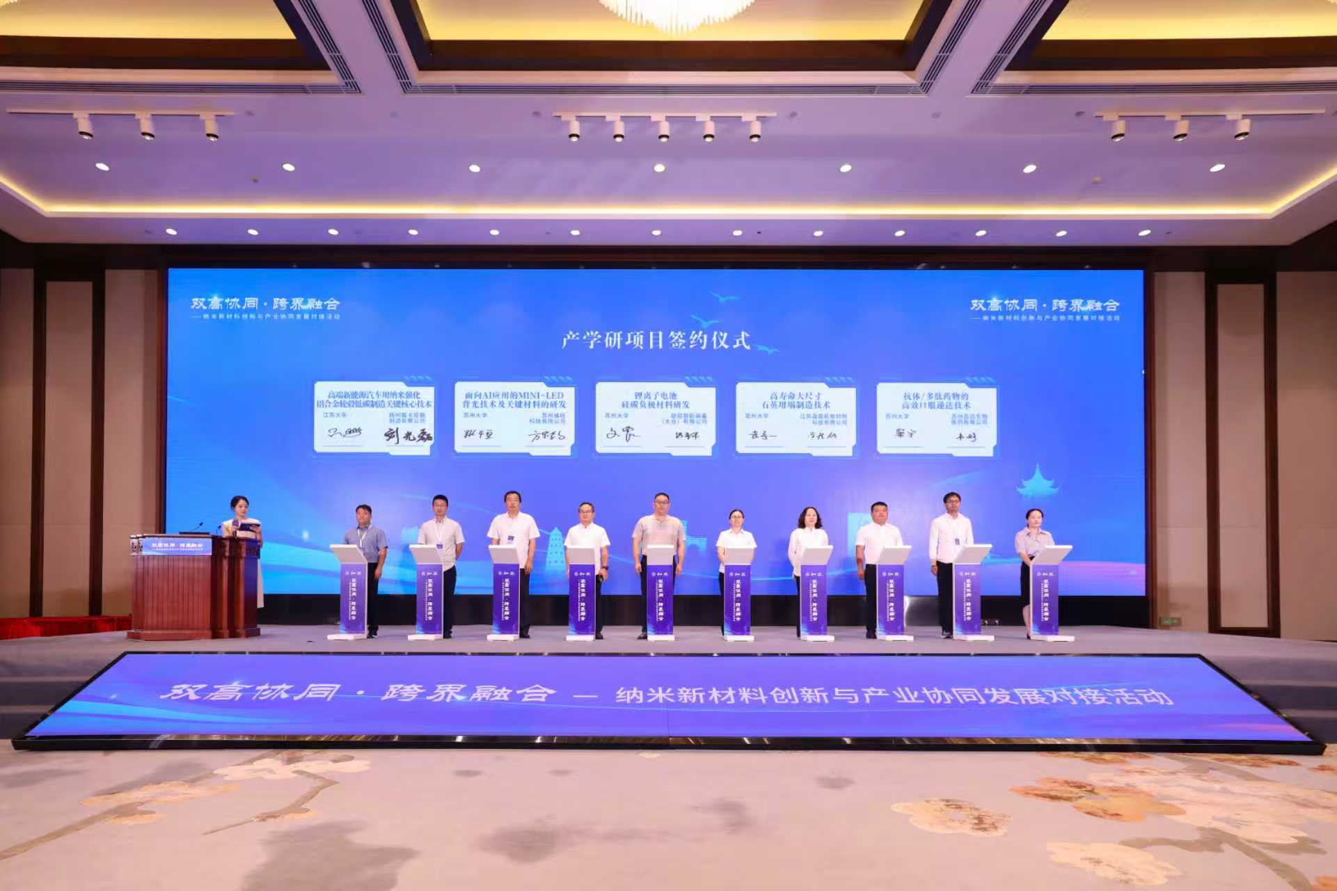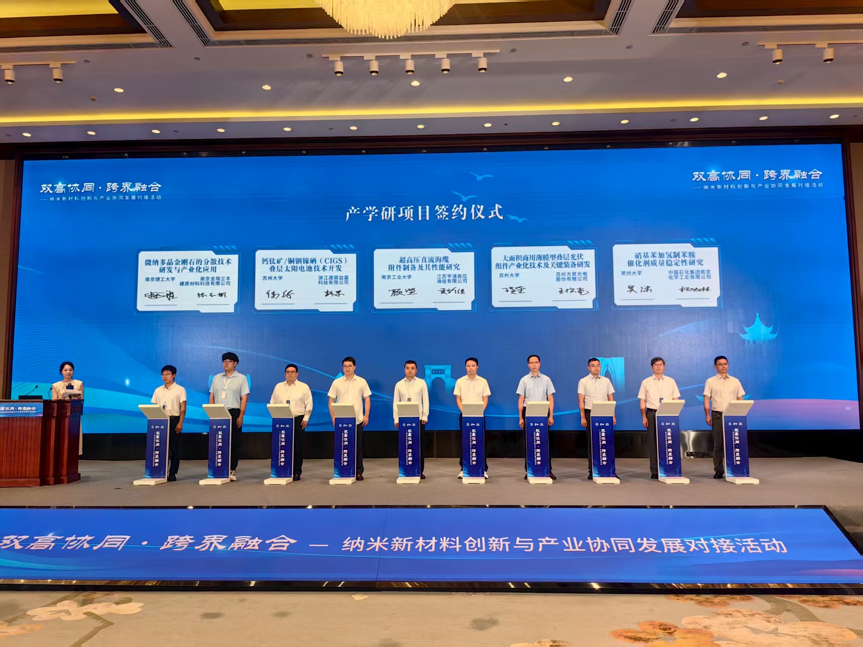 苏州纳米科技协同创新中心与全国高校先进材料区域技术转移转化中心(江苏)签署合作协议,中国药科大学等6所高校协同创新中心与全国高校生物医药区域技术转移转化中心(江苏苏州)达成共建共识,10个校企合作项目同步签约,其中我校光伏科学与工程协同创新中心、先进催化与绿色制造协同创新中心分别与江苏晶盛旺新材料科技有限公司、中石化南京化工研究院有限公司签约合作项目。常州大学等江苏高校纳米新材料领域多项重大科技成果同步发布,涵盖光伏、生物医药、环境治理、半导体材料等关键领域。
